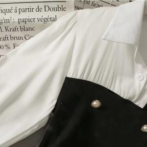 Contrast-Panel Top – Featuring Pearl Button Accents, a Flattering Peplum Silhouette, and a Timeless Black & White Palette