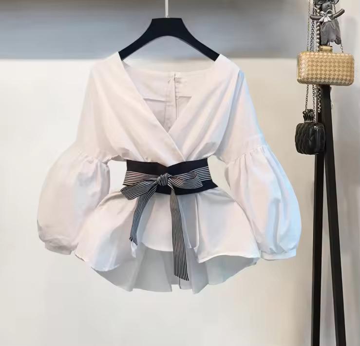 Wrap Top With Voluminous Sleeves And A Waist-Defining Belt With Sleek Black Slit-Hem Trouser
